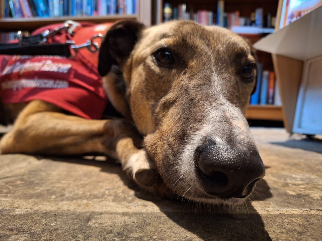 Charlie Bear is a very sweet boy. He’s fairly big ….. the height of a small greyhound, but ‘big boned’ with lovely big feet and a wider face. Charlie loves his humans and bonds with new friends in a matter of minutes. He is kind, cuddly and funny.