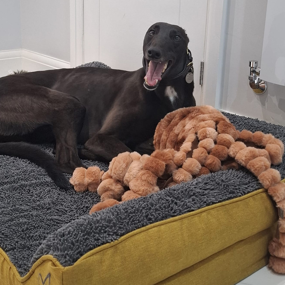 Shaggy Rodgers is a gorgeous boy – he is very happy and laid back with a very waggy tail and lots of greyhounds leans. He is currently in a foster home with a mixed breed dog and he is being a very good boy.